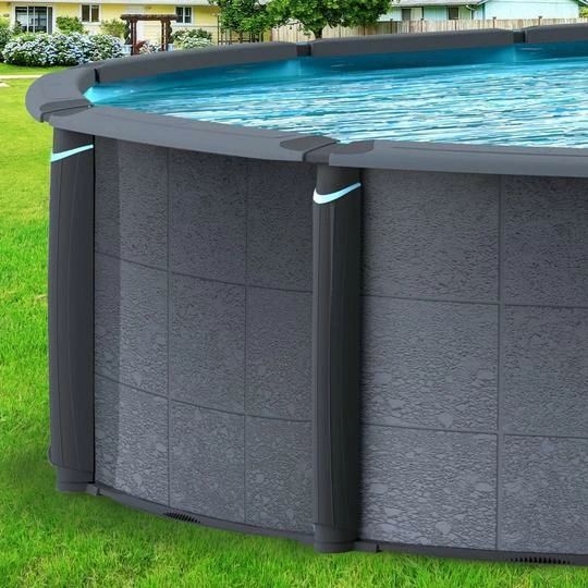 The Edge Above Ground Pool is not just one of the sturdiest pools on the market, but one of the most elegant with its textured rocktile design. This pool includes substantial 8-inch injected molded resin top ledges for maximum stability. The two-color ledge cover provides incredible style and contrast around the pool.