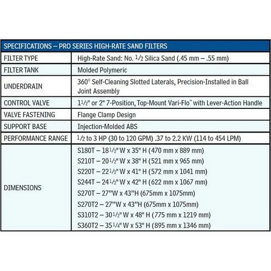 The Hayward W3S220T Pro Series 22″ Sand Filter with 1-1/2″ Top Mount Multiport Valve provides you with quality you can trust. The Hayward Pro Series high-rate sand filters incorporate the latest pool filter technology to ensure your in ground or above ground pool is operating at its very best. The Hayward Pro Series 22″ Sand Filter includes all the laterals inside the tank, filter tank base, pressure gauge, and Top Mount 1-1/2″ Multiport Valve. The Hayward W3S220T has a 22″ tank requiring 250 lbs. of sand (not included) for operation. Molded of durable, corrosion-proof reinforced thermoplastic, they feature attractive, unitized tank construction for years of trouble-free operation with only minimal care. Pro Series sets a new standard for performance, value and dependability.