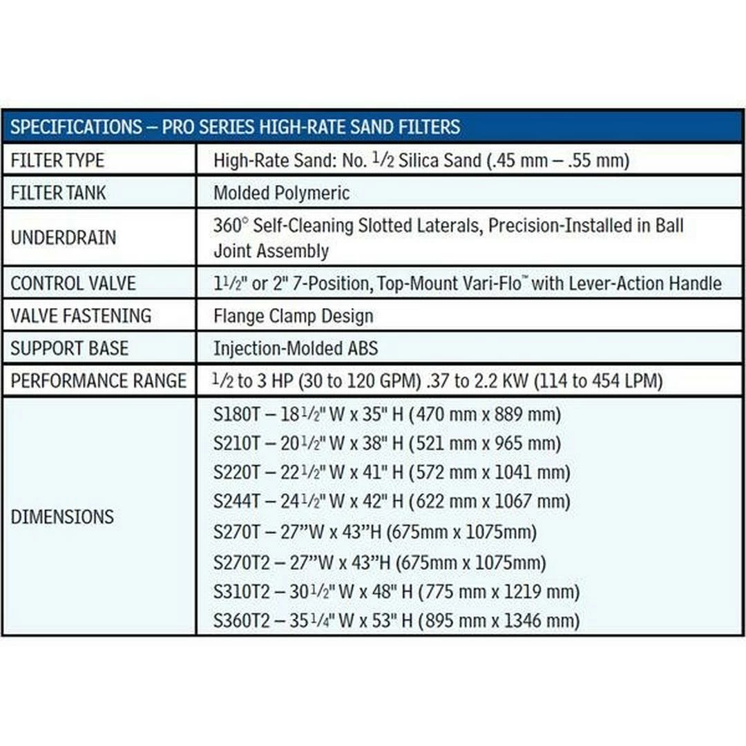 The Hayward W3S244T Pro Series 24″ Sand Filter with 1-1/2″ Top Mount Multiport Valve provides you with quality you can trust. The Hayward Pro Series high-rate sand filters incorporate the latest pool filter technology to ensure your in ground or above ground pool is operating at its very best. The Hayward Pro Series 24″ Sand Filter includes all the laterals inside the tank, filter tank base, pressure gauge, and Top Mount 1-1/2″ Multiport Valve. The Hayward W3S244T has a 24″ tank requiring 300 lbs. of sand (not included) for operation. Molded of durable, corrosion-proof reinforced thermoplastic, they feature attractive, unitized tank construction for years of trouble-free operation with only minimal care. Pro Series sets a new standard for performance, value and dependability.