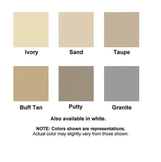 - Available in several shades: taupe, granite, sand, ivory, white, putty and buff tan.