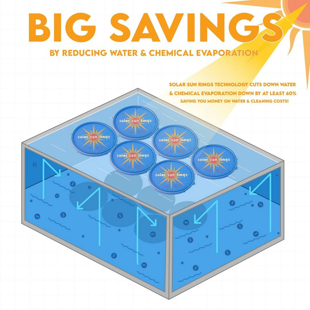 Neither water nor pool chemicals can evaporate through the Solar Sun Rings two layers of heavyweight vinyl. You will save water and chemicals about equal to the percentage of the surface covered. Once the water in your pool has reached adequate temperature, Solar Sun Rings may be turned over to conserve water by limiting evaporation without significantly heating the water.